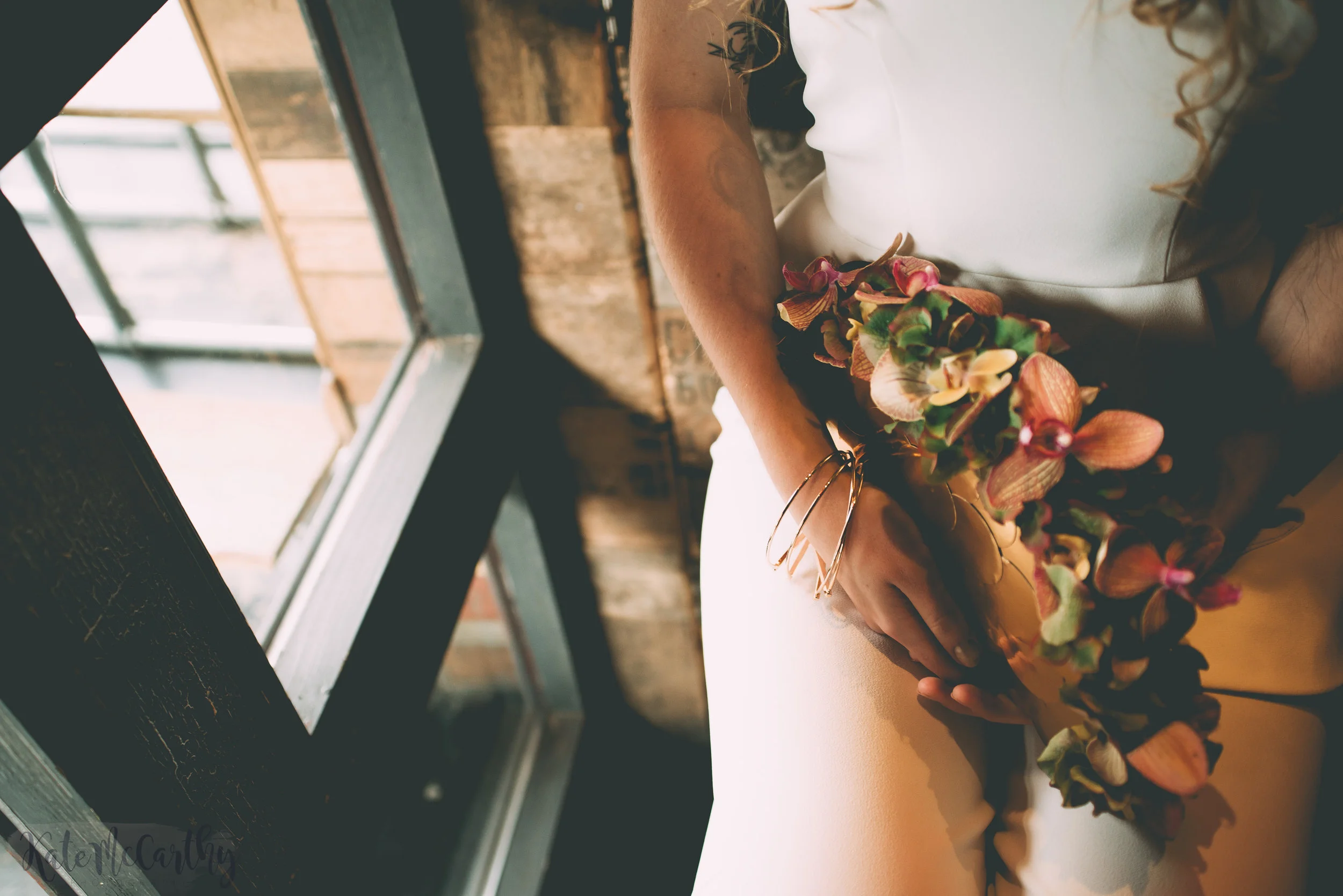 My most recent styled shoot organised by the wonderful and warm Nicole Boneuf of the up and coming wedding site Bridal Chic in the City got in touch with me in August about the idea of organising a Studio 54-meets-Manchester bridal shoot at the gloriously rock n' roll Deaf Institute on Oxford Road in the city centre in advance of their October 'Wedtastic' open day where I'd be setting up my own exhibit. I jumped at the chance to shoot at such an iconic venue and Nicole assembled a serious dream team of wedding vendors: dresses and impeccably tailored jumpsuits by Jessica Bennett Bespoke Bride, a floral clutch (as a twist on a bridal bouquet) and more traditional autumnal bouquet by Paragon Floral Design, makeup by the insanely awesome Mimi Lomax MUA, hair by the lovely Becky Betty Hair, a bridal beret by Satyrion by Anneliese, jewellery by the oh-so-talented Rachel from The Magpie's Daughter and all being filmed by the lovely Phil from Base Aura videography.