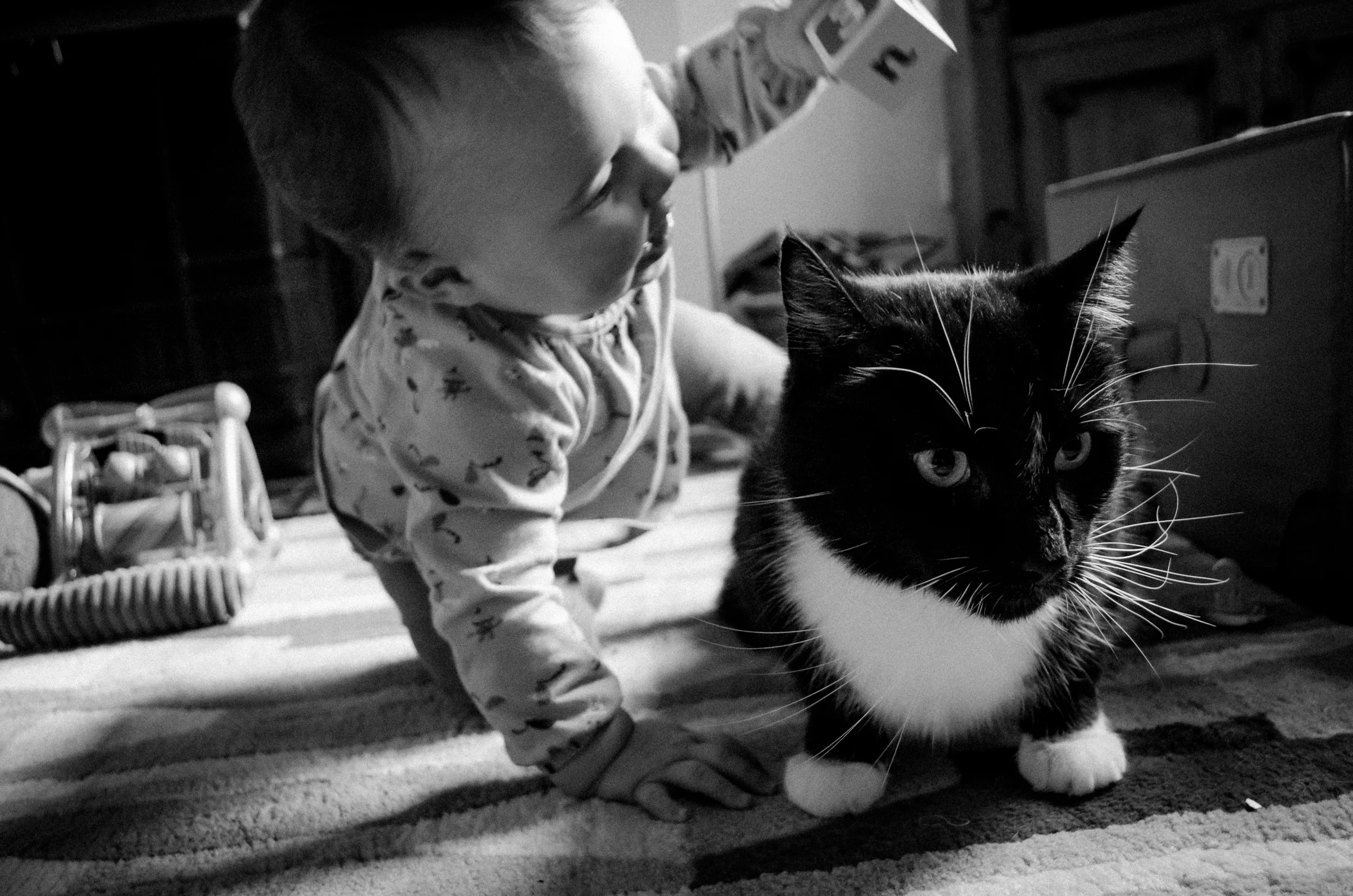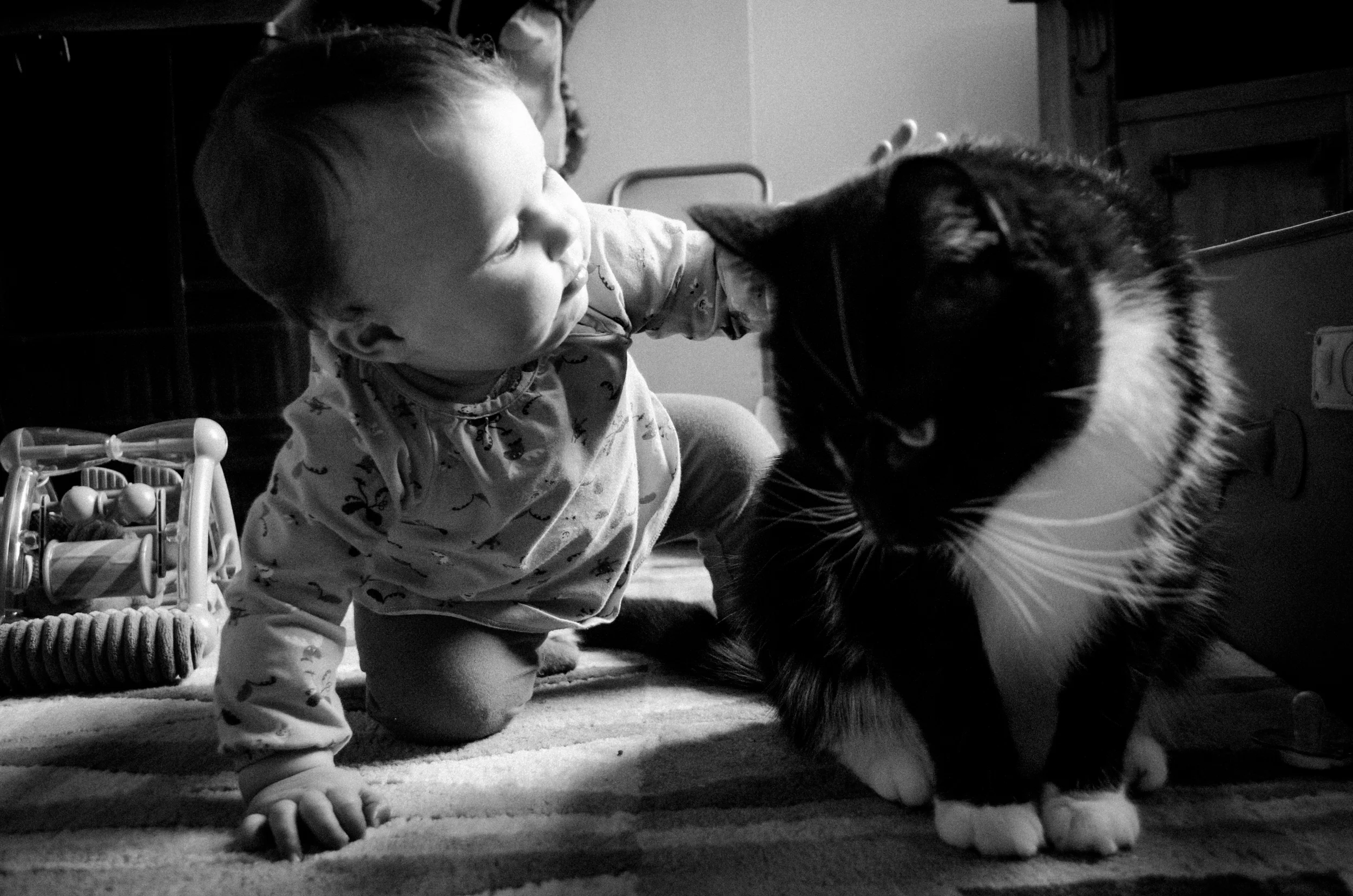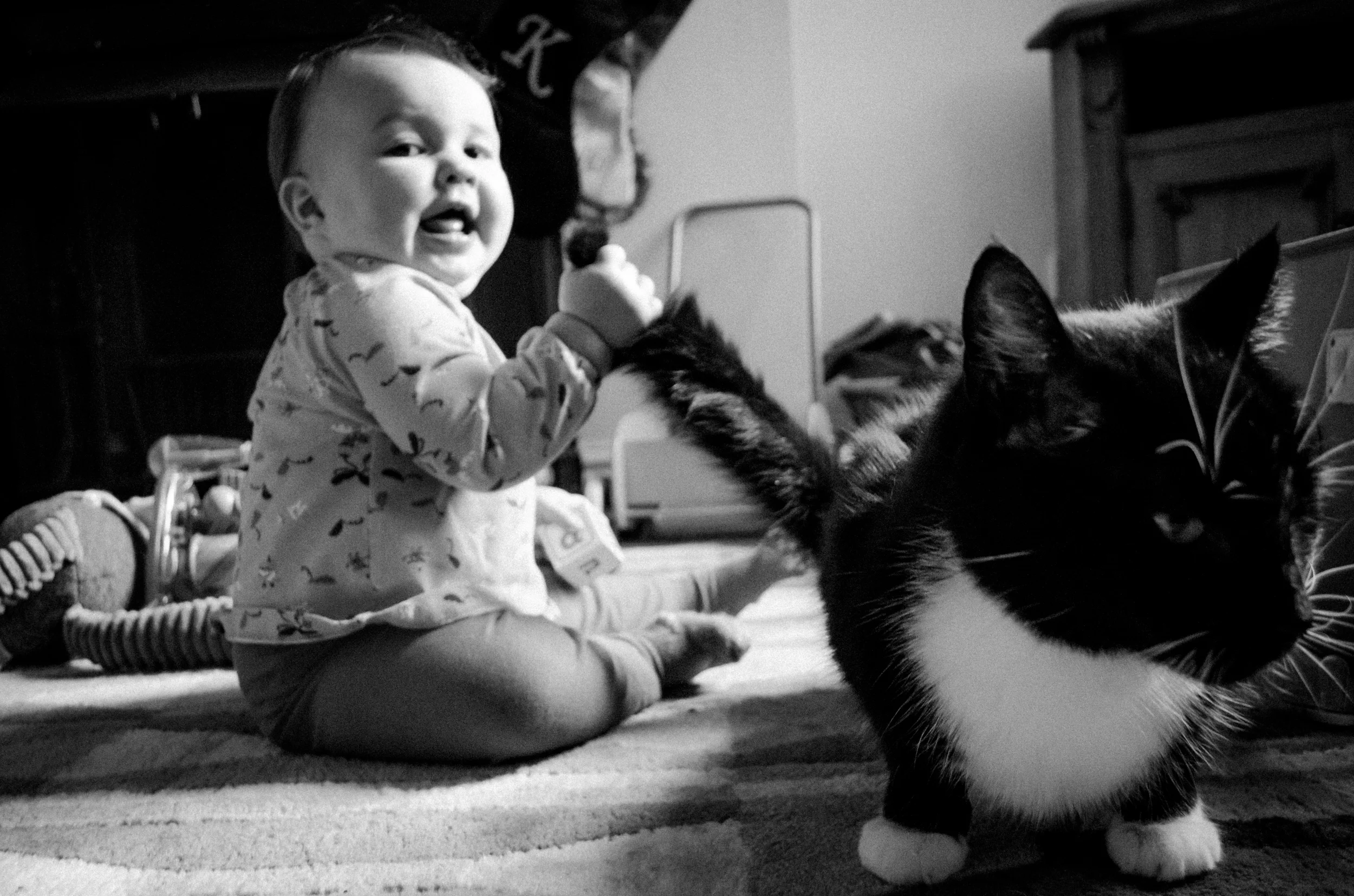 After two trips to the GP, nearly a full bottle of Calpol, a tub of baby vapour rub, 2 refill packs of menthol plug-ins and many many tears (mine, not hers), our girl finally pulled throughand by Monday she was back to her normal cheeky, cheery, energetic self with just a bit of a runny nose to remind us of the horror of the last 2 weeks. She was in such a good mood that I managed to get some photos of her and her best playmate, Hugo the Cat.