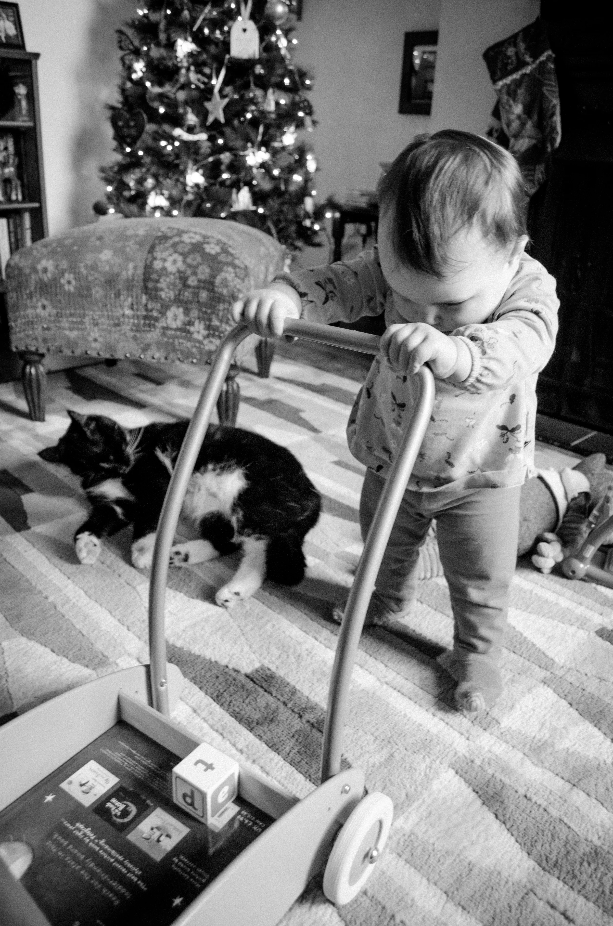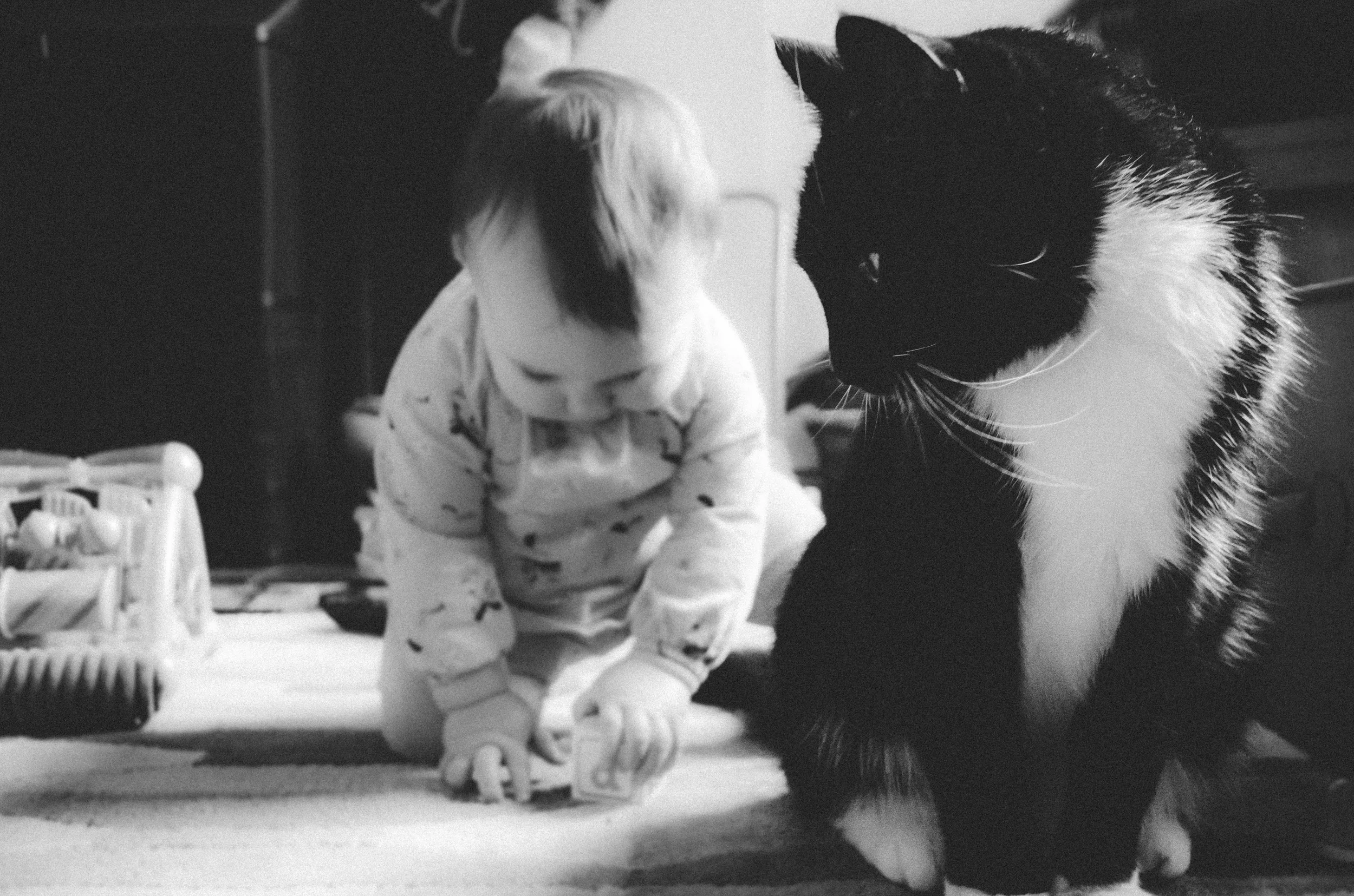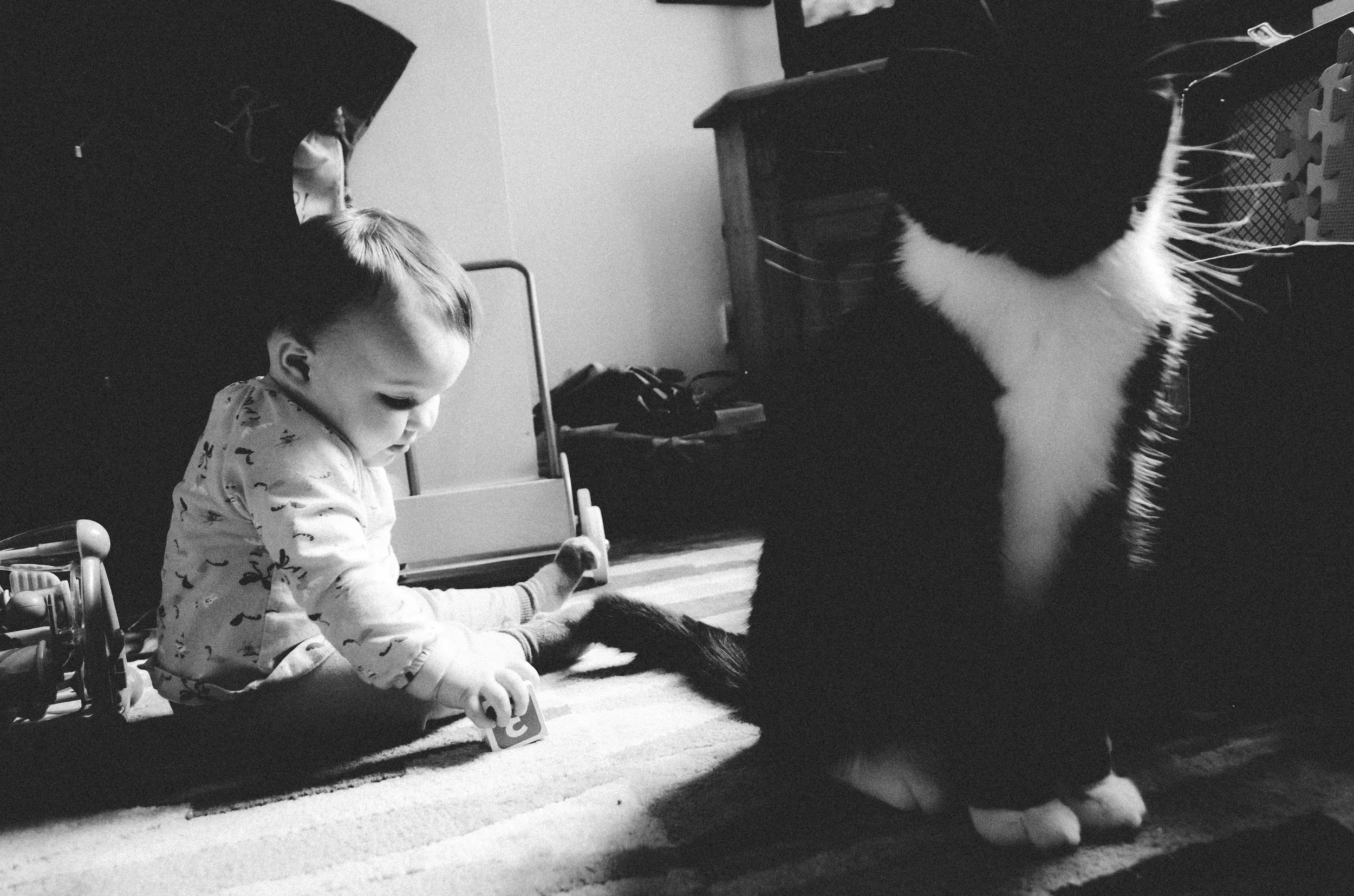 After two trips to the GP, nearly a full bottle of Calpol, a tub of baby vapour rub, 2 refill packs of menthol plug-ins and many many tears (mine, not hers), our girl finally pulled throughand by Monday she was back to her normal cheeky, cheery, energetic self with just a bit of a runny nose to remind us of the horror of the last 2 weeks. She was in such a good mood that I managed to get some photos of her and her best playmate, Hugo the Cat.
