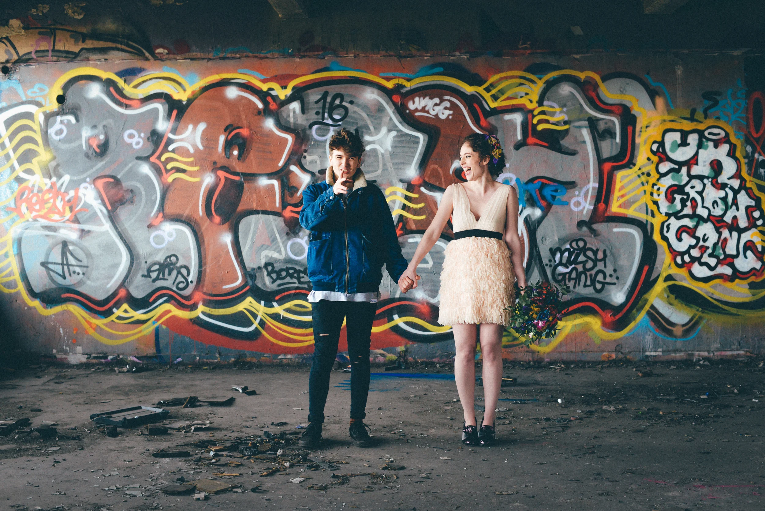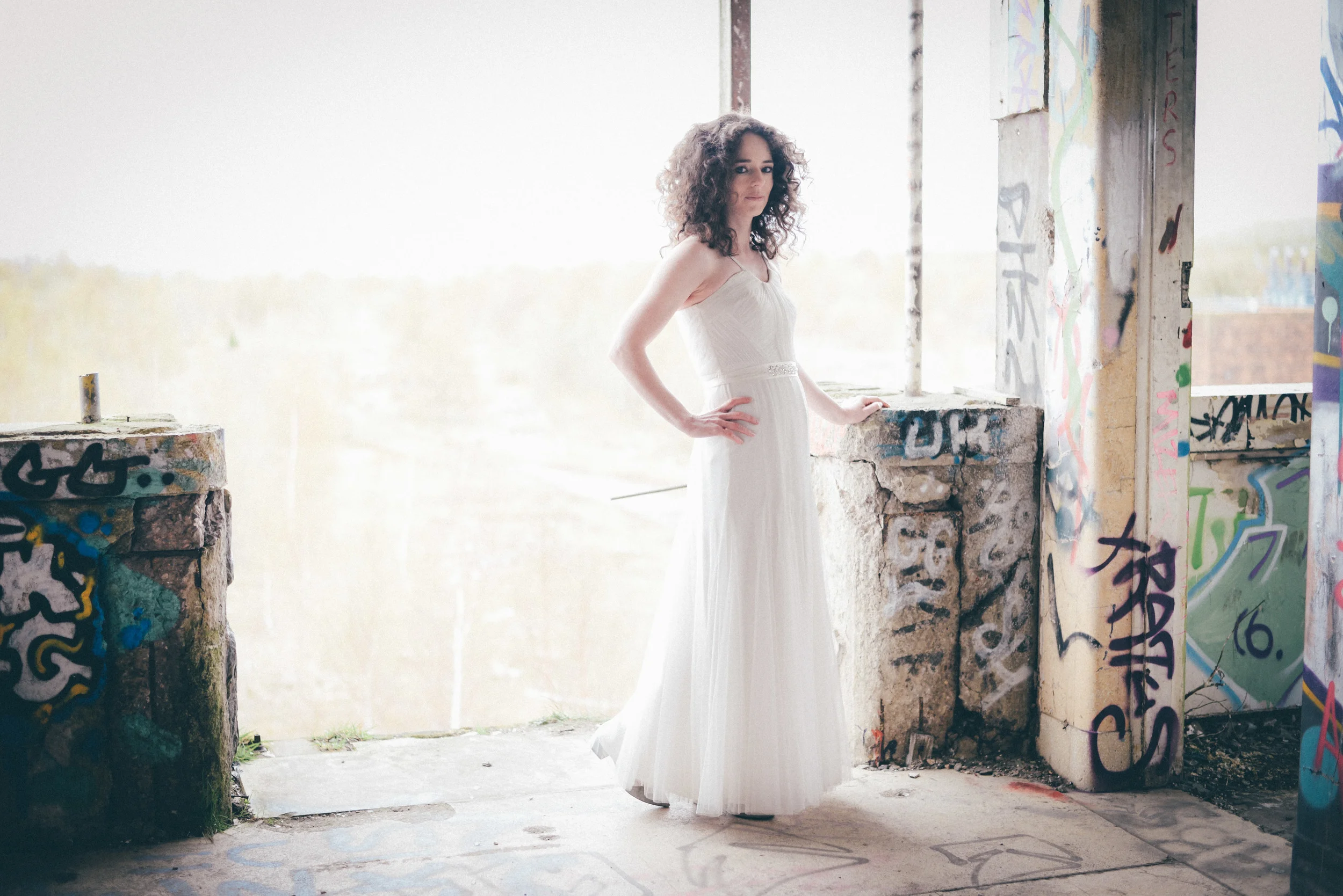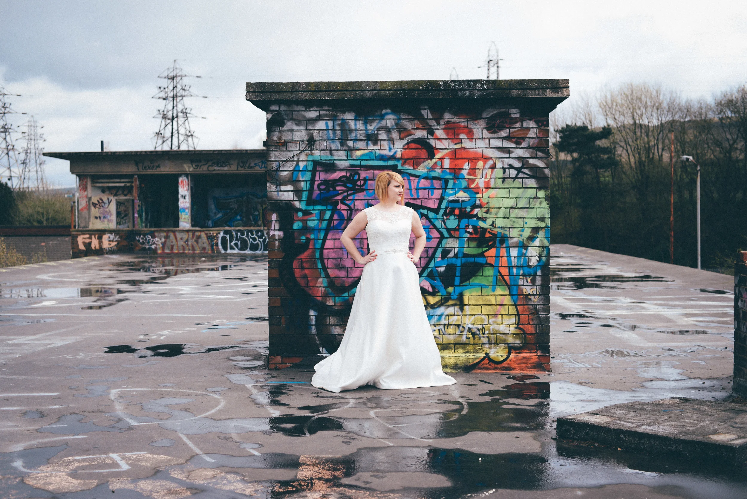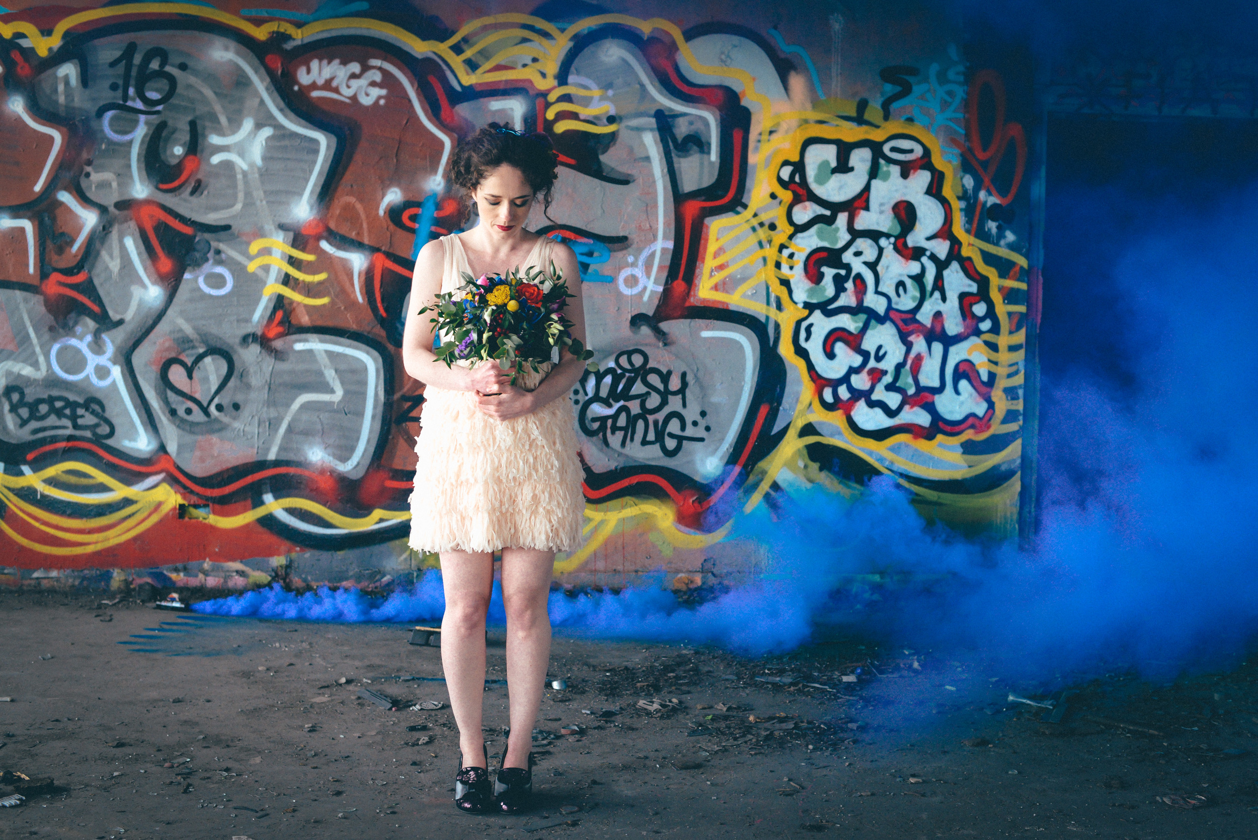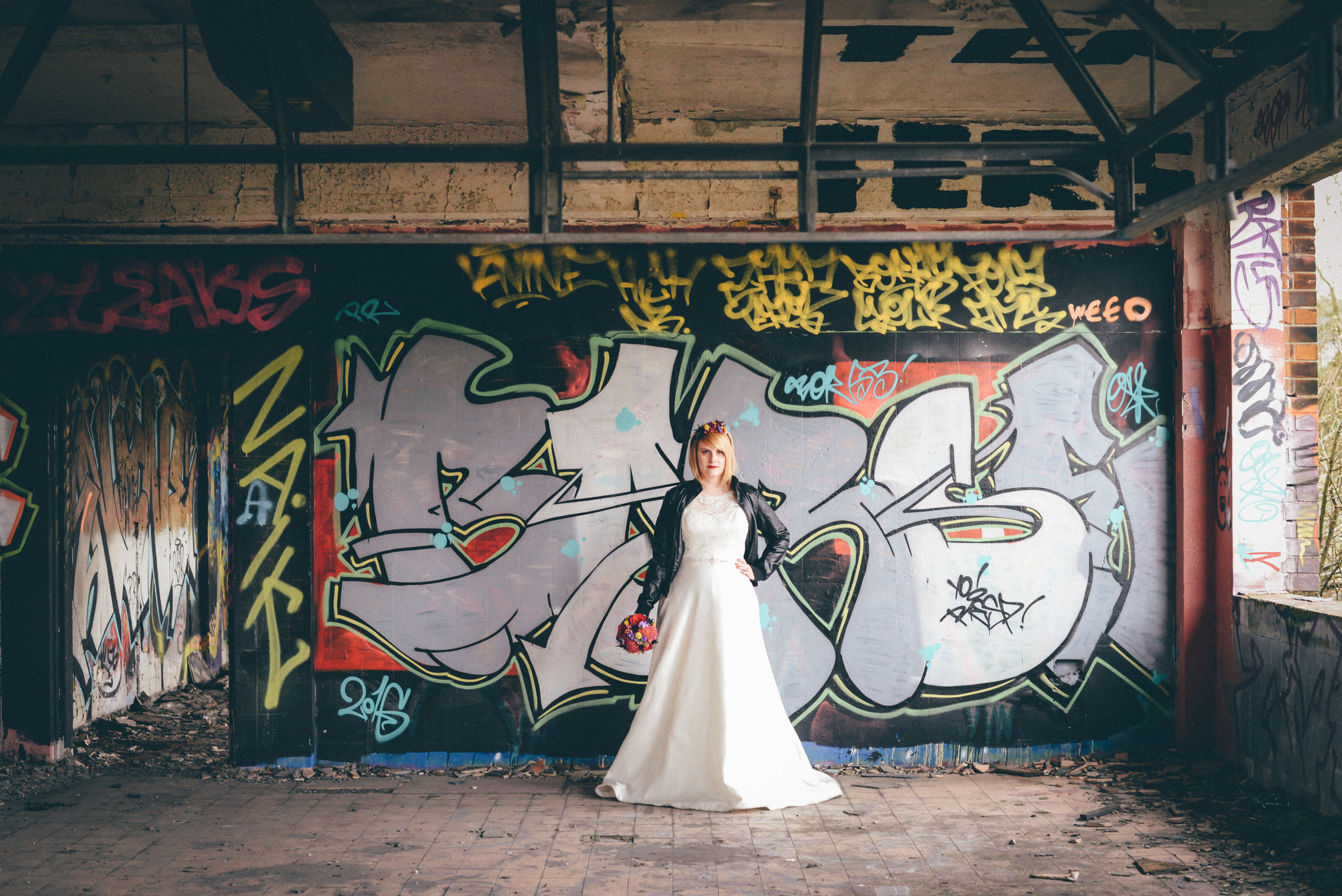 A few weeks ago I was working on the other side of the camera (as a bridal model, long story, so awkward) and as is always the case, began talking shop with the photographer. It was one of those very nerdy technical conversations that photographers do so well but the subject came up about styled shoots and how it was tough to get one together that ticked all the boxes but still inspired us. We were both after the same thing: gorgeous models who still looked like real people, fab dresses, some smoke for drama and a killer location. Immediately, his eyes lit up and he started telling me about this multi-story abandoned power station near Burnley that was covered in graffiti and quite easy to get to (always fairly accessible so we wouldn't feel like we were breaking too many laws!). Conversation turned to other subjects but in the following weeks, we continued to slowly eke out a plan: borrowing wedding dresses from family and friends (we couldn't risk a collab with a bridal shop as the location was seriously rough around the edges); signing up a MUA, his wife and my bff as models, getting a local florist on board, even a videographer to document the proceedings! We were short a groom but on the day managed to pinch the very stylish teenage runner to snuggle up to the lovely Liz. The whole shoot was a labour of love and between the setting, the enthusiasm & commitment of the whole team involved and some killer details, I am so so very proud of the result. I hope you enjoy! Special thanks to: Nik Bryant Photography, Satin Pictures Wedding Photography, Kat Horrocks MUA, Bliss Flower Art, Models Liz Parker and Laura Bryant, Jamie Sharp for the heavy lifting (and the spur of the moment modeling!) and the Langley kids for their enthusiasm and general morale boosting! xx