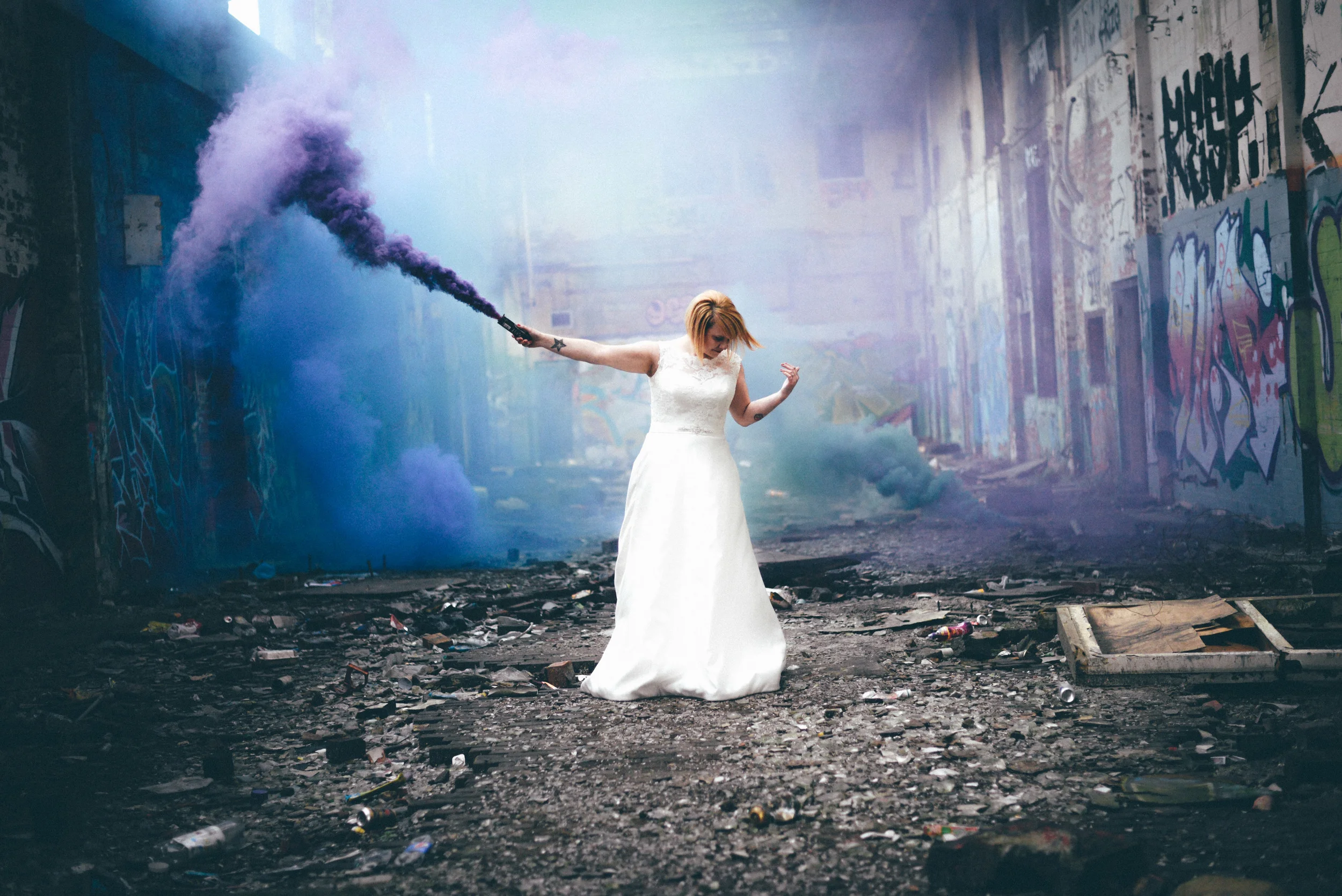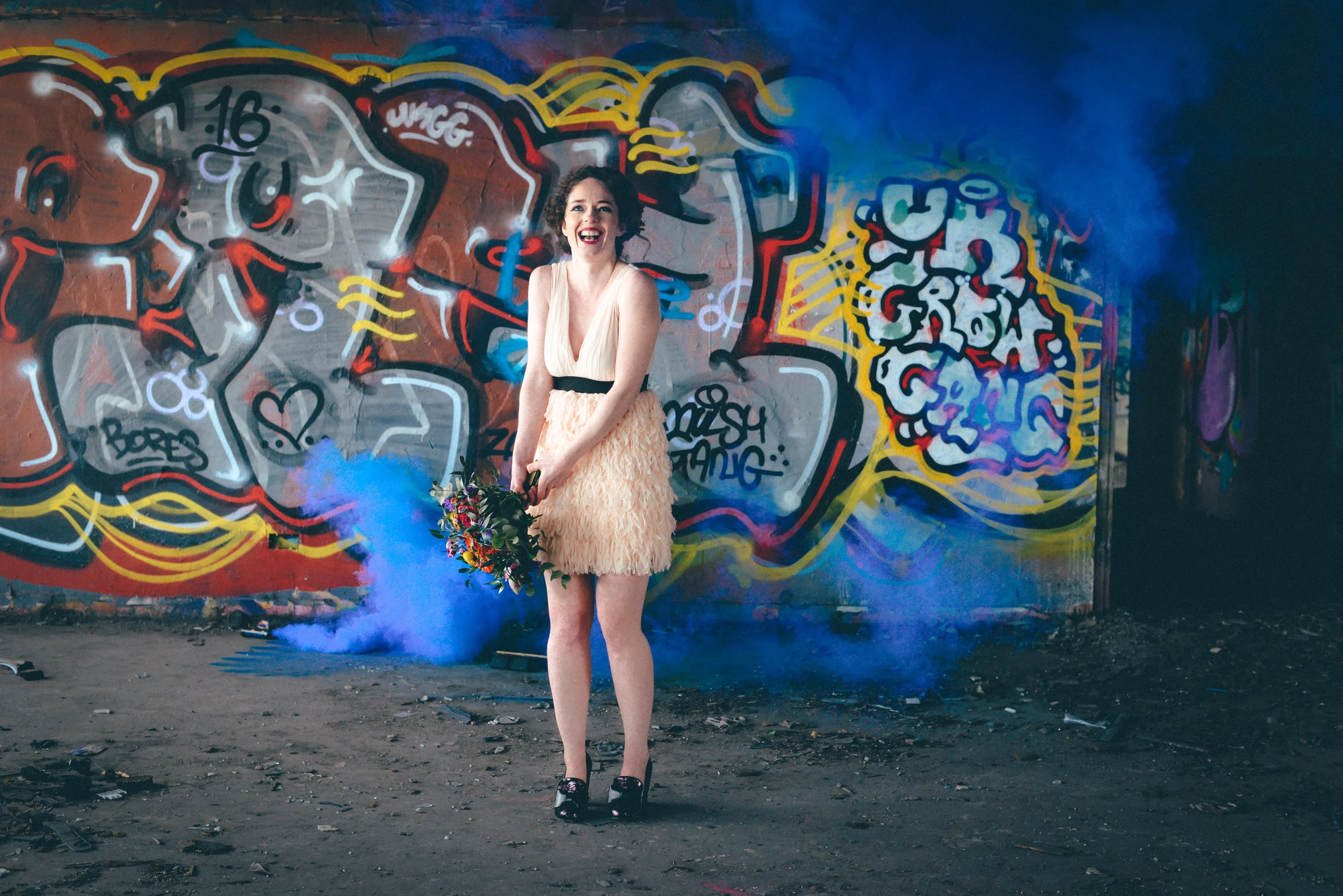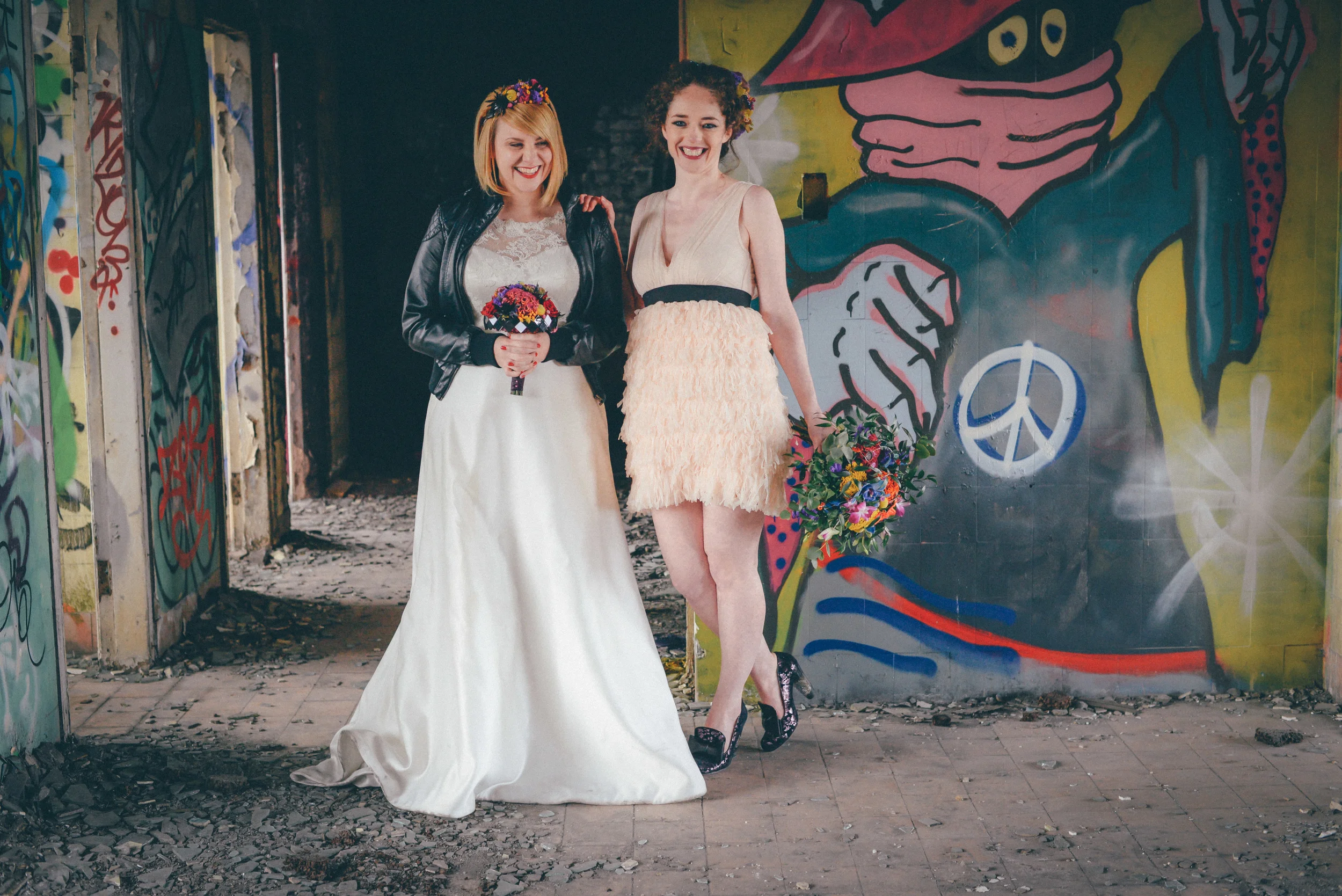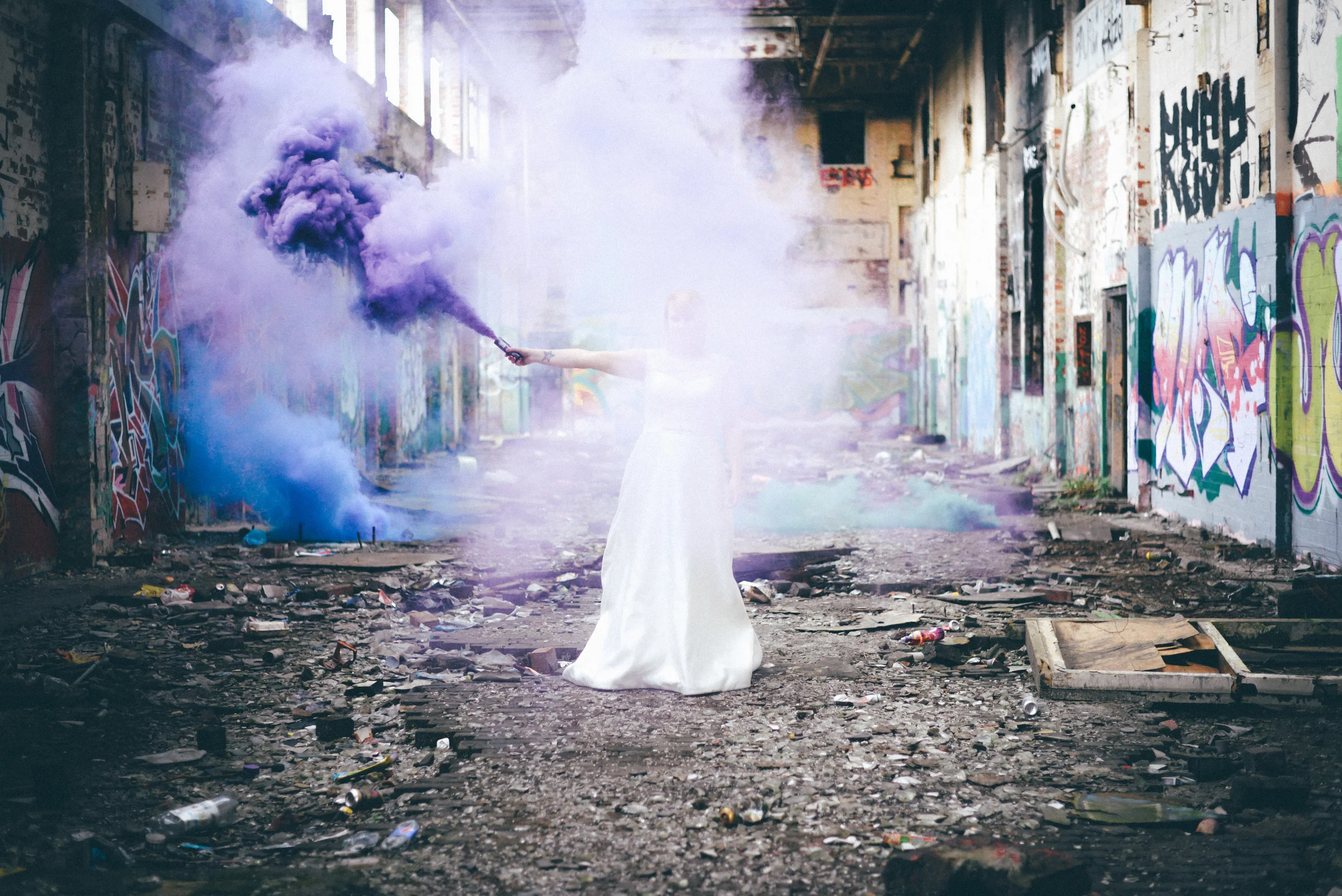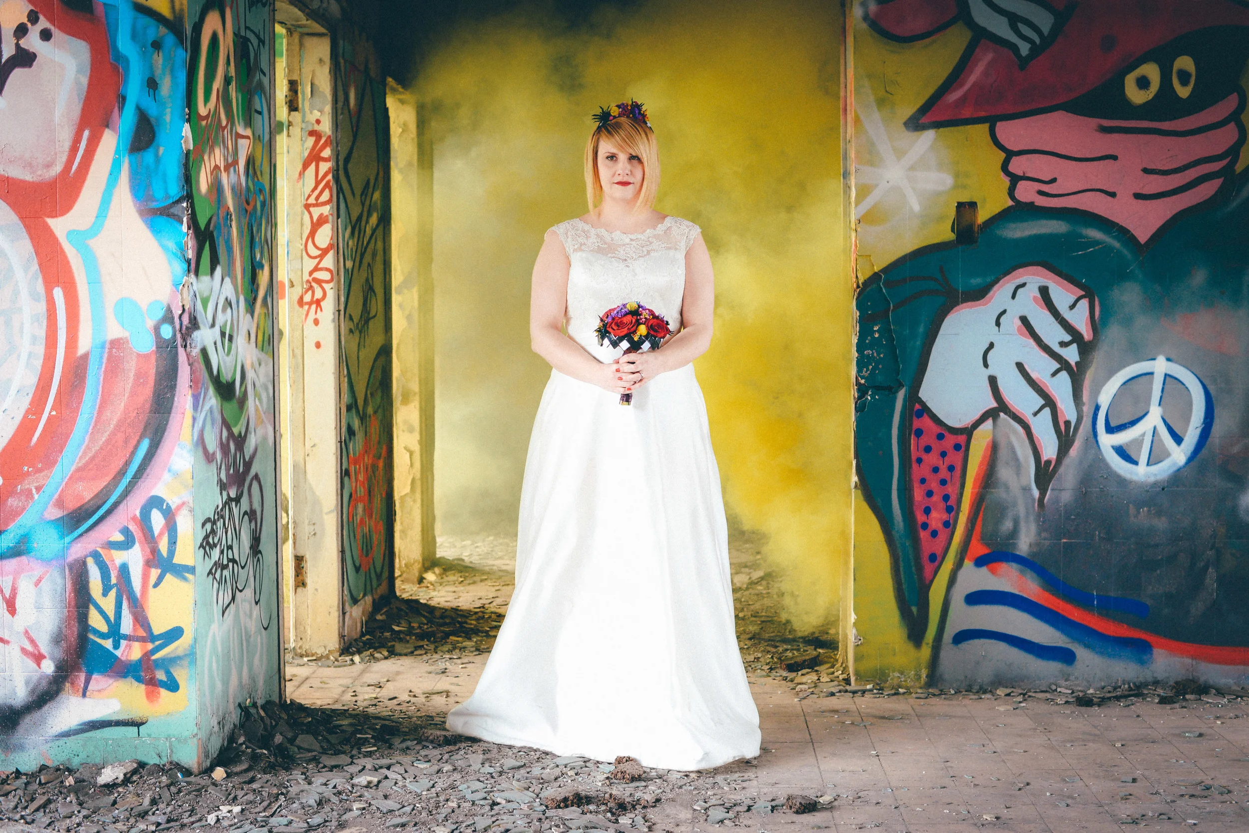 A few weeks ago I was working on the other side of the camera (as a bridal model, long story, so awkward) and as is always the case, began talking shop with the photographer. It was one of those very nerdy technical conversations that photographers do so well but the subject came up about styled shoots and how it was tough to get one together that ticked all the boxes but still inspired us. We were both after the same thing: gorgeous models who still looked like real people, fab dresses, some smoke for drama and a killer location. Immediately, his eyes lit up and he started telling me about this multi-story abandoned power station near Burnley that was covered in graffiti and quite easy to get to (always fairly accessible so we wouldn't feel like we were breaking too many laws!). Conversation turned to other subjects but in the following weeks, we continued to slowly eke out a plan: borrowing wedding dresses from family and friends (we couldn't risk a collab with a bridal shop as the location was seriously rough around the edges); signing up a MUA, his wife and my bff as models, getting a local florist on board, even a videographer to document the proceedings! We were short a groom but on the day managed to pinch the very stylish teenage runner to snuggle up to the lovely Liz. The whole shoot was a labour of love and between the setting, the enthusiasm & commitment of the whole team involved and some killer details, I am so so very proud of the result. I hope you enjoy! Special thanks to: Nik Bryant Photography, Satin Pictures Wedding Photography, Kat Horrocks MUA, Bliss Flower Art, Models Liz Parker and Laura Bryant, Jamie Sharp for the heavy lifting (and the spur of the moment modeling!) and the Langley kids for their enthusiasm and general morale boosting! xx