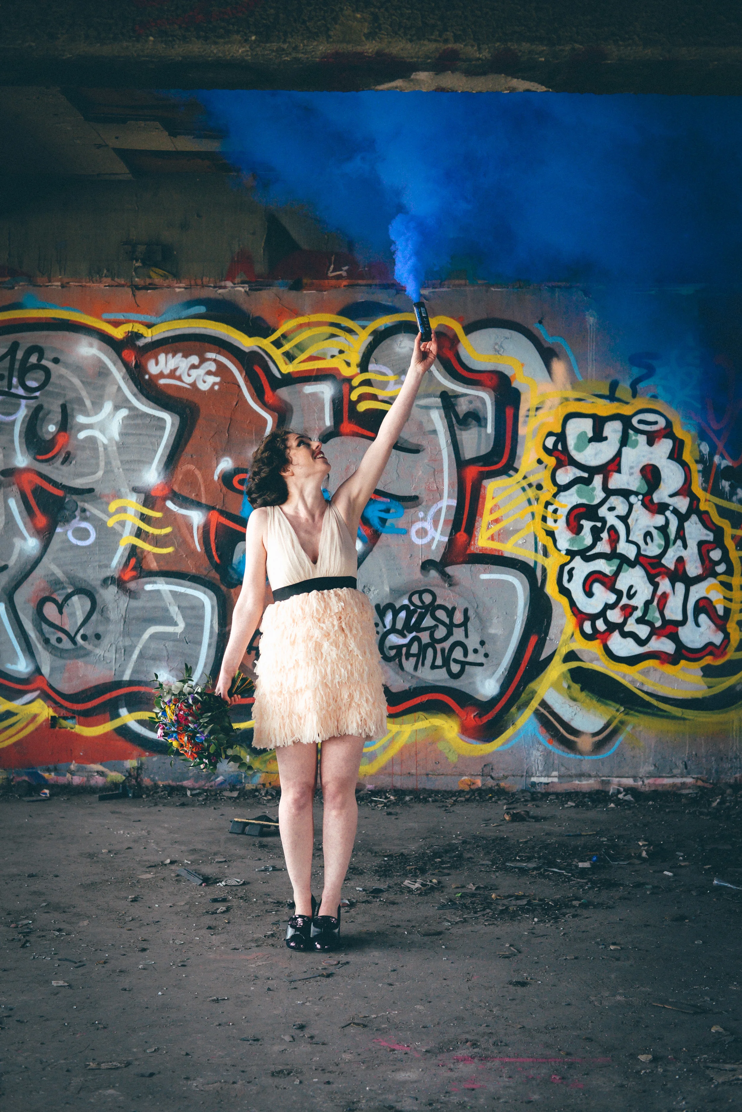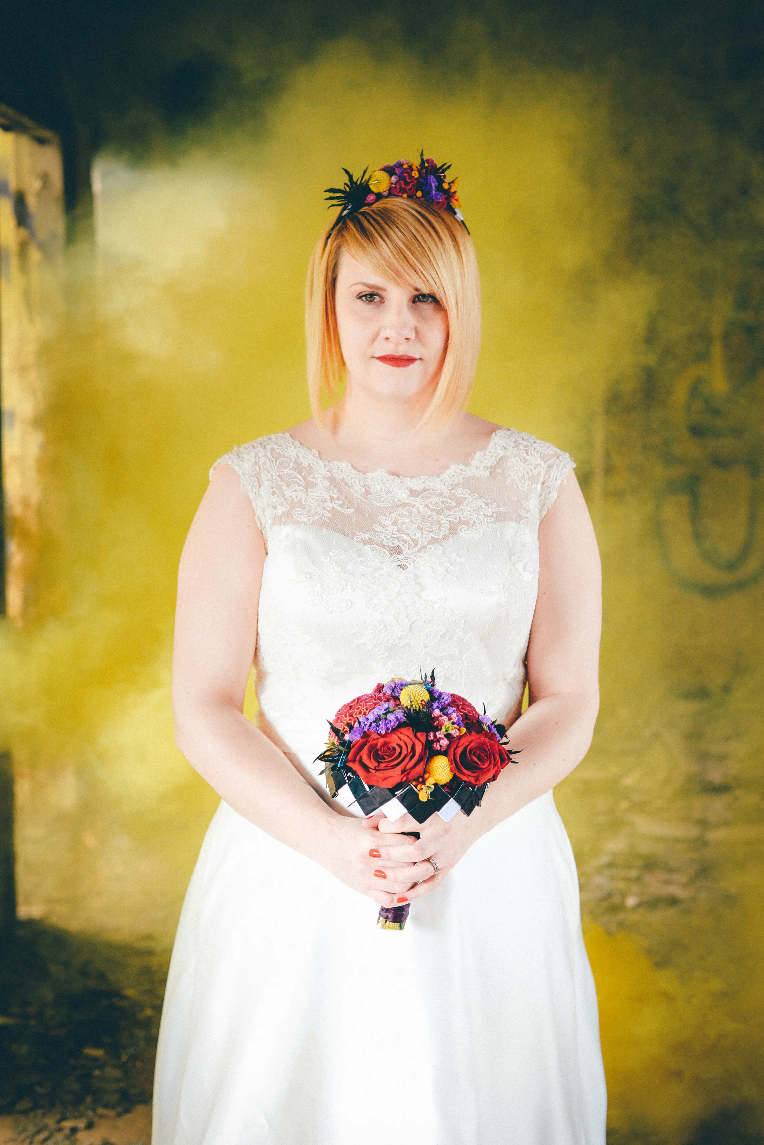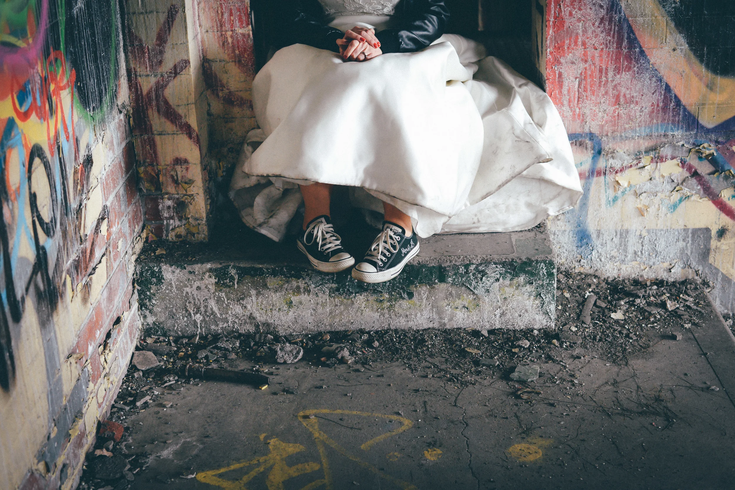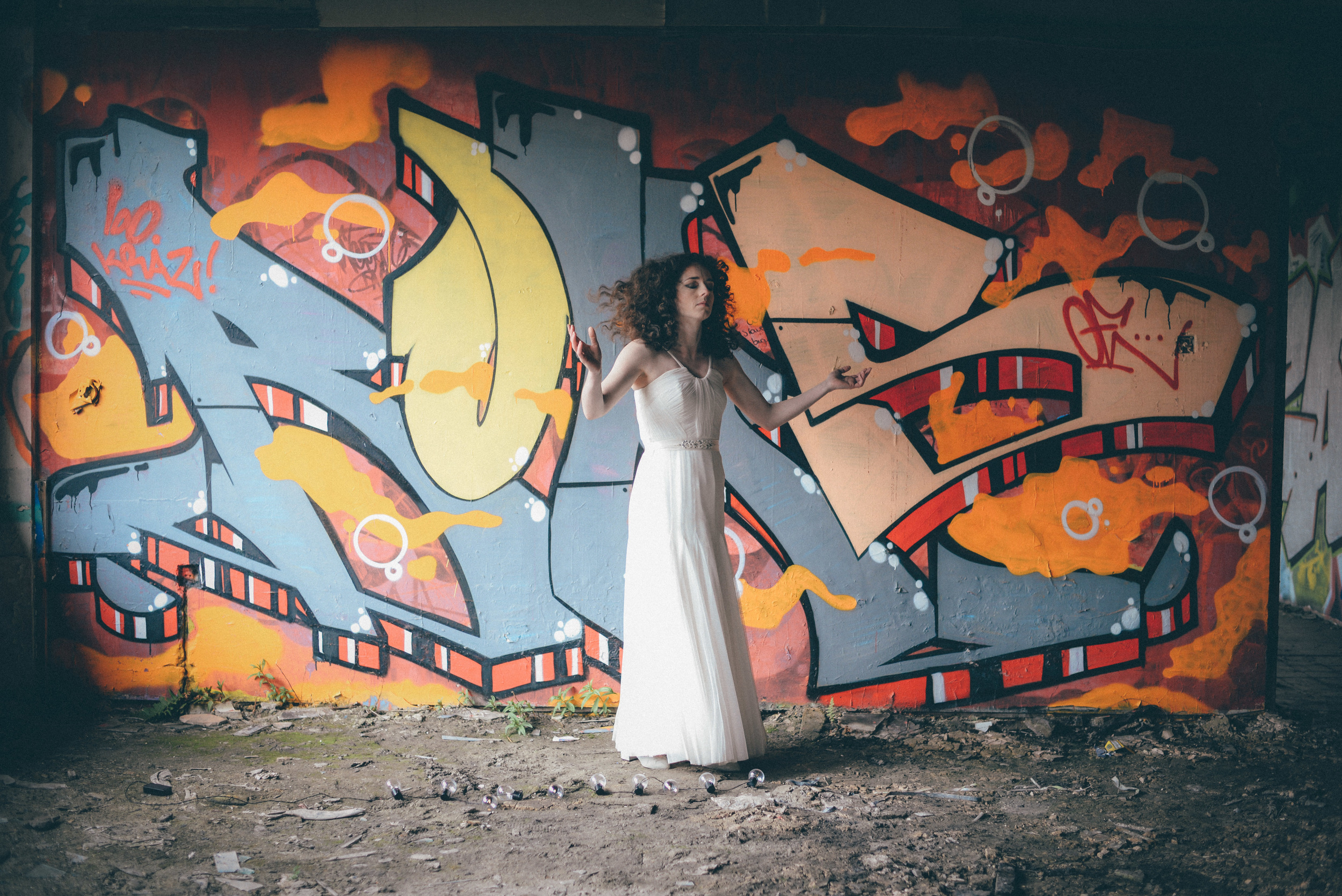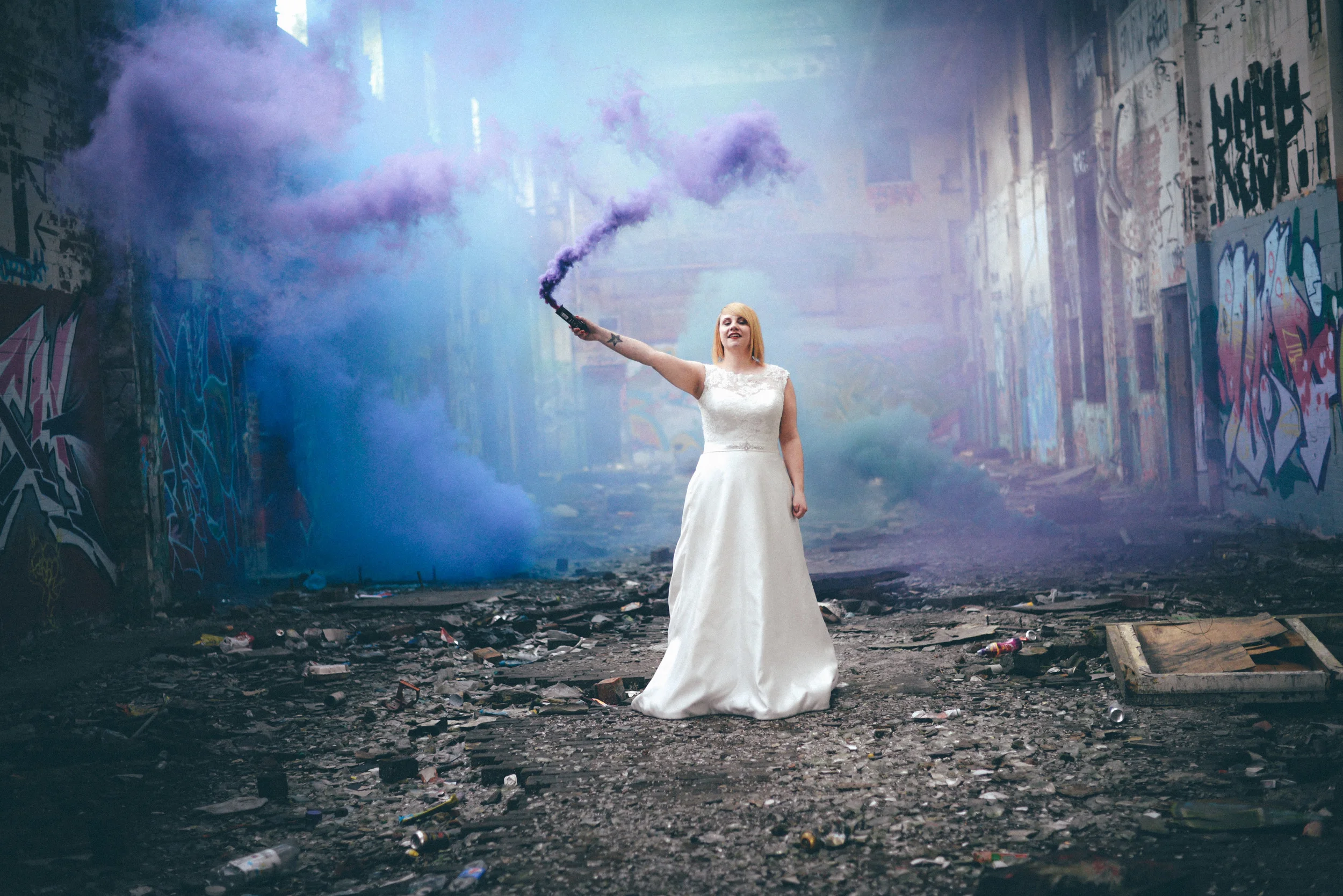 A few weeks ago I was working on the other side of the camera (as a bridal model, long story, so awkward) and as is always the case, began talking shop with the photographer. It was one of those very nerdy technical conversations that photographers do so well but the subject came up about styled shoots and how it was tough to get one together that ticked all the boxes but still inspired us. We were both after the same thing: gorgeous models who still looked like real people, fab dresses, some smoke for drama and a killer location. Immediately, his eyes lit up and he started telling me about this multi-story abandoned power station near Burnley that was covered in graffiti and quite easy to get to (always fairly accessible so we wouldn't feel like we were breaking too many laws!). Conversation turned to other subjects but in the following weeks, we continued to slowly eke out a plan: borrowing wedding dresses from family and friends (we couldn't risk a collab with a bridal shop as the location was seriously rough around the edges); signing up a MUA, his wife and my bff as models, getting a local florist on board, even a videographer to document the proceedings! We were short a groom but on the day managed to pinch the very stylish teenage runner to snuggle up to the lovely Liz. The whole shoot was a labour of love and between the setting, the enthusiasm & commitment of the whole team involved and some killer details, I am so so very proud of the result. I hope you enjoy! Special thanks to: Nik Bryant Photography, Satin Pictures Wedding Photography, Kat Horrocks MUA, Bliss Flower Art, Models Liz Parker and Laura Bryant, Jamie Sharp for the heavy lifting (and the spur of the moment modeling!) and the Langley kids for their enthusiasm and general morale boosting! xx
