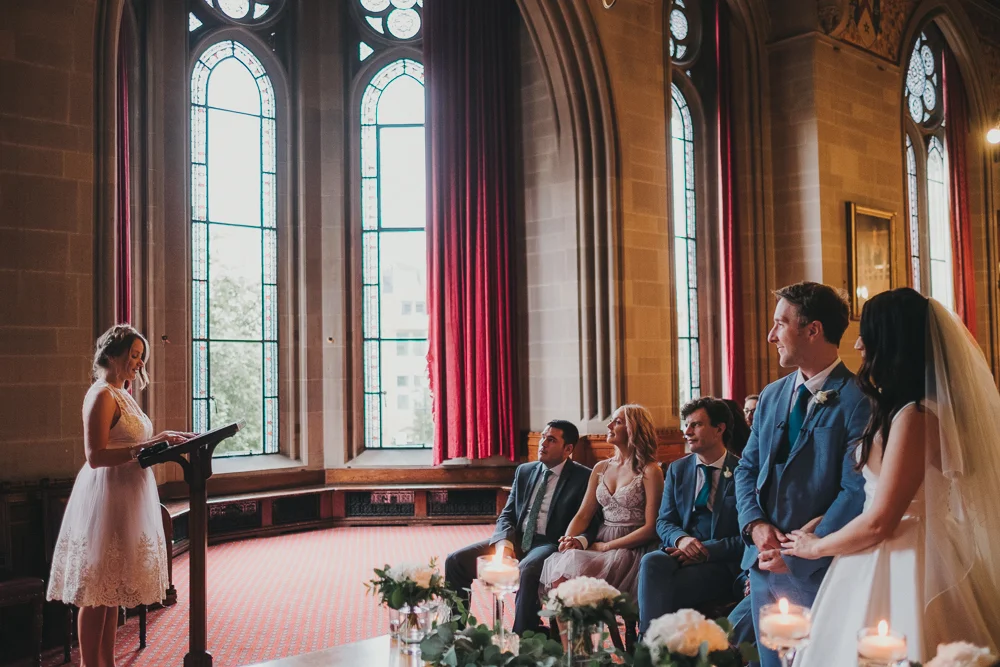 The ceremony was a beautiful service in the upstairs of the town hall. The best part of the town hall is how rich the setting is, the space is so steeped in history that it requires very little adornment and so additional decoration was kept to a minimum in favour of lettin gthe room speak for itself. During the ceremony they had a beautiful reading. It was a real tear-jerker and so emotional. And the giggles balanced out the tears, you could feel so much love in the room.