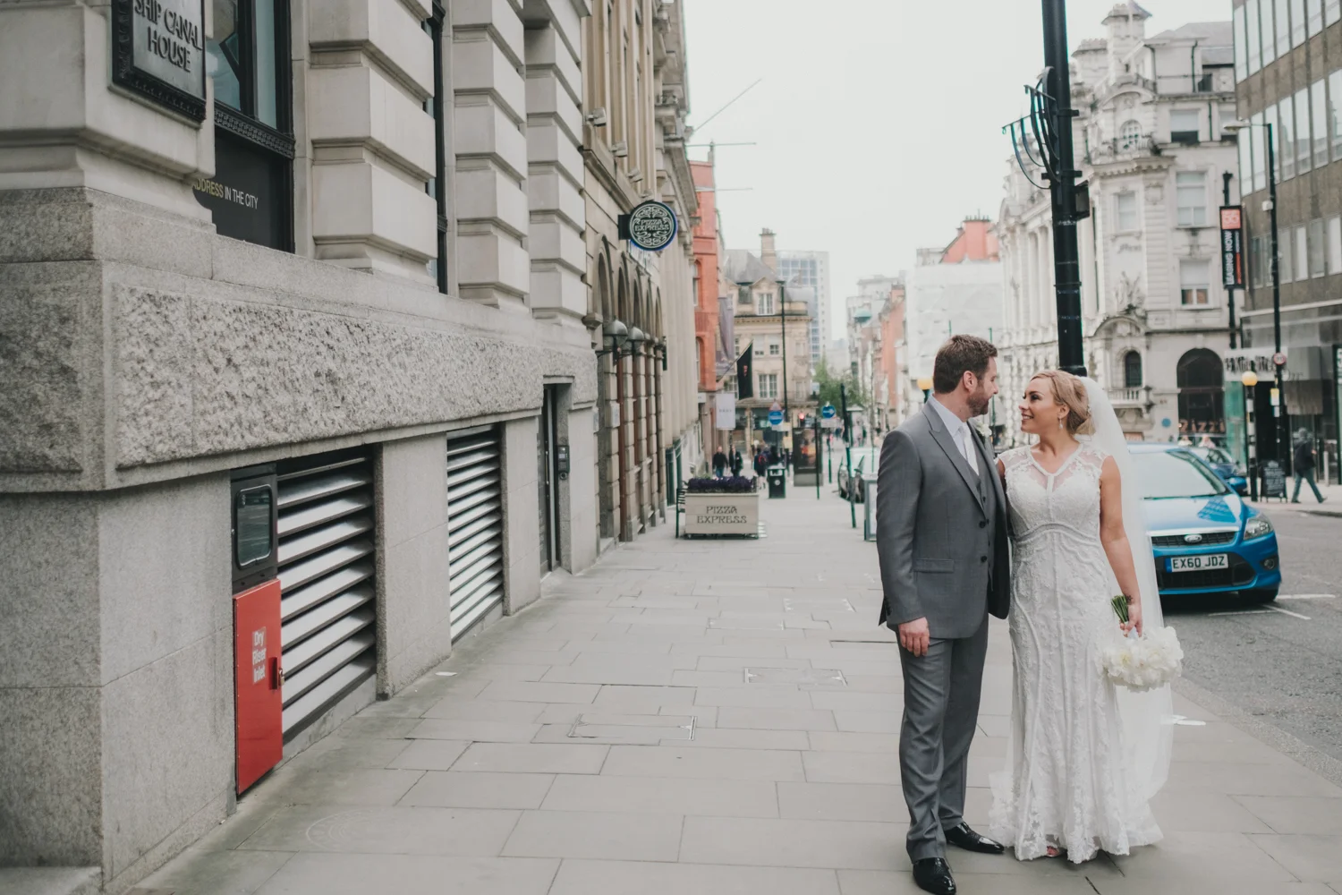 So after neglecting this blog for a month or so, I'm thrilled to kick things back off with the outrageously chic and stylish King Street Townhouse wedding of Rob & Elizabeth from the end of April. I LOVE Manchester City Centre weddings and the challenge of showing off the varied architecture, the industrial grit, the steel greys and monochrome landscape and juxtaposing the softness and elegance of lace and beading and flowers. You may remember the gorgeous and hilarious Rob & Liz from their Chester town centre engagement shoot back at the end of last year. Rob kept Liz and I in stitches and their wedding day was no different, capped off with one of the funniest and most heartfelt groom's speeches I've heard to date!