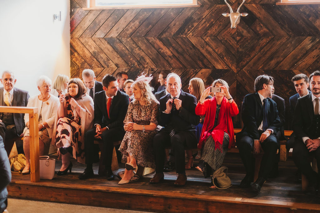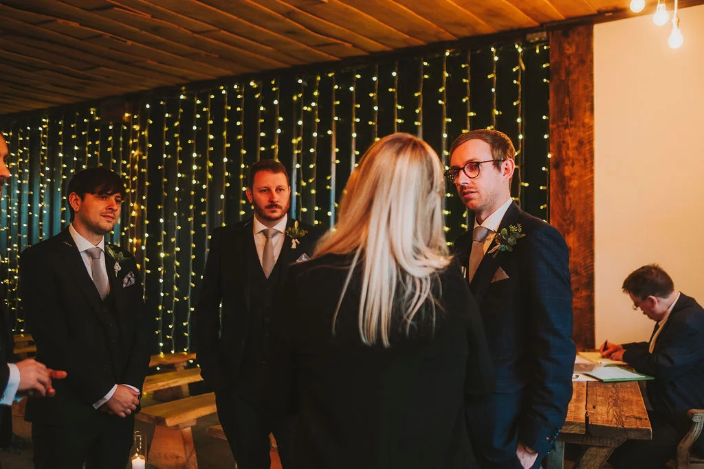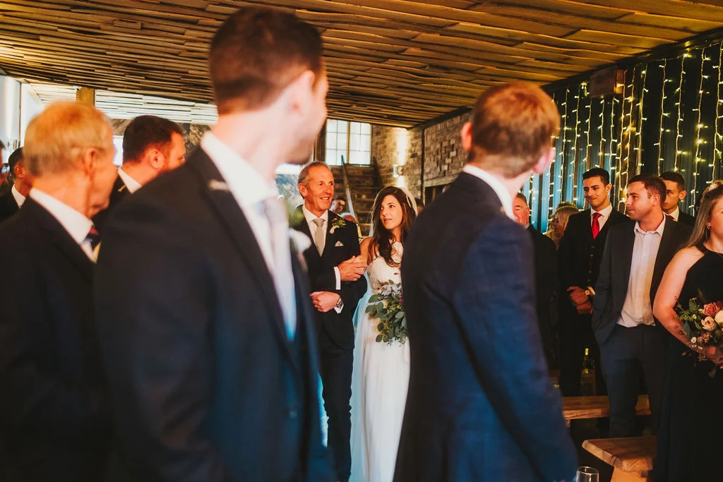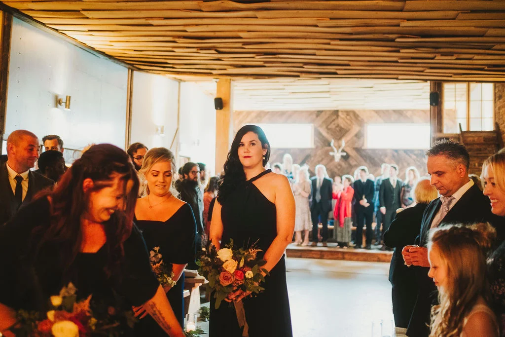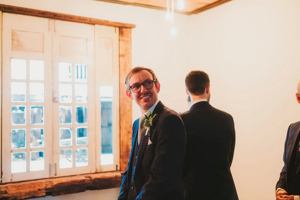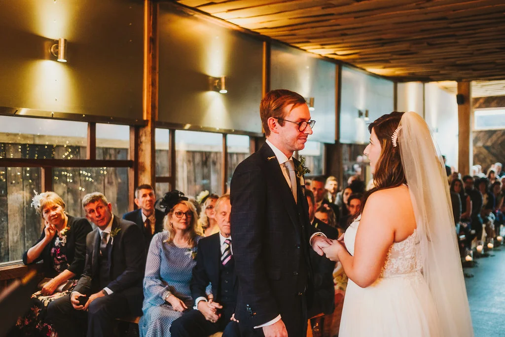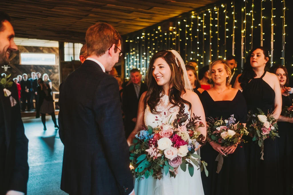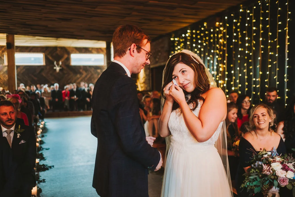 Sarah got ready in the fabulous bridal prep suite, surrounded by her beautiful sisters & bridesmaids, and the atmosphere was full of excitement. We had tunes playing and prosecco was poured and it was just a lovely buzzy atmosphere. She then walked the short distance from the prep suite to get to the ceremony. One of my favourite things about shooting weddings at Owen House Wedding Barn is how close everything is together and how seamlessly the day flows. Shaun got ready on site in one of the gorgeous chalets just next to the main ceremony room.