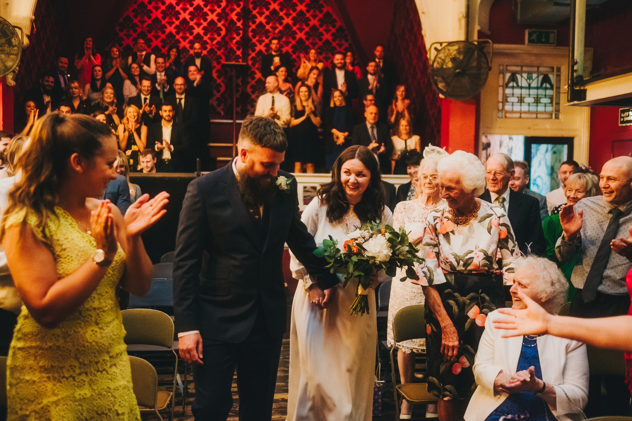 The ceremony took place in the iconic upstairs music hall, set up as if for a gig with guests filling the raised bleachers and seats below. The ceremony area was arranged to be facing the stage with our lovebirds stood at the front, which was perfect for the surroundings. The ceremony began with the couple walking down the aisle together, and finished with a big cheer from everyone. It was a wonderful ceremony, full of nervous giggles and so much love.
