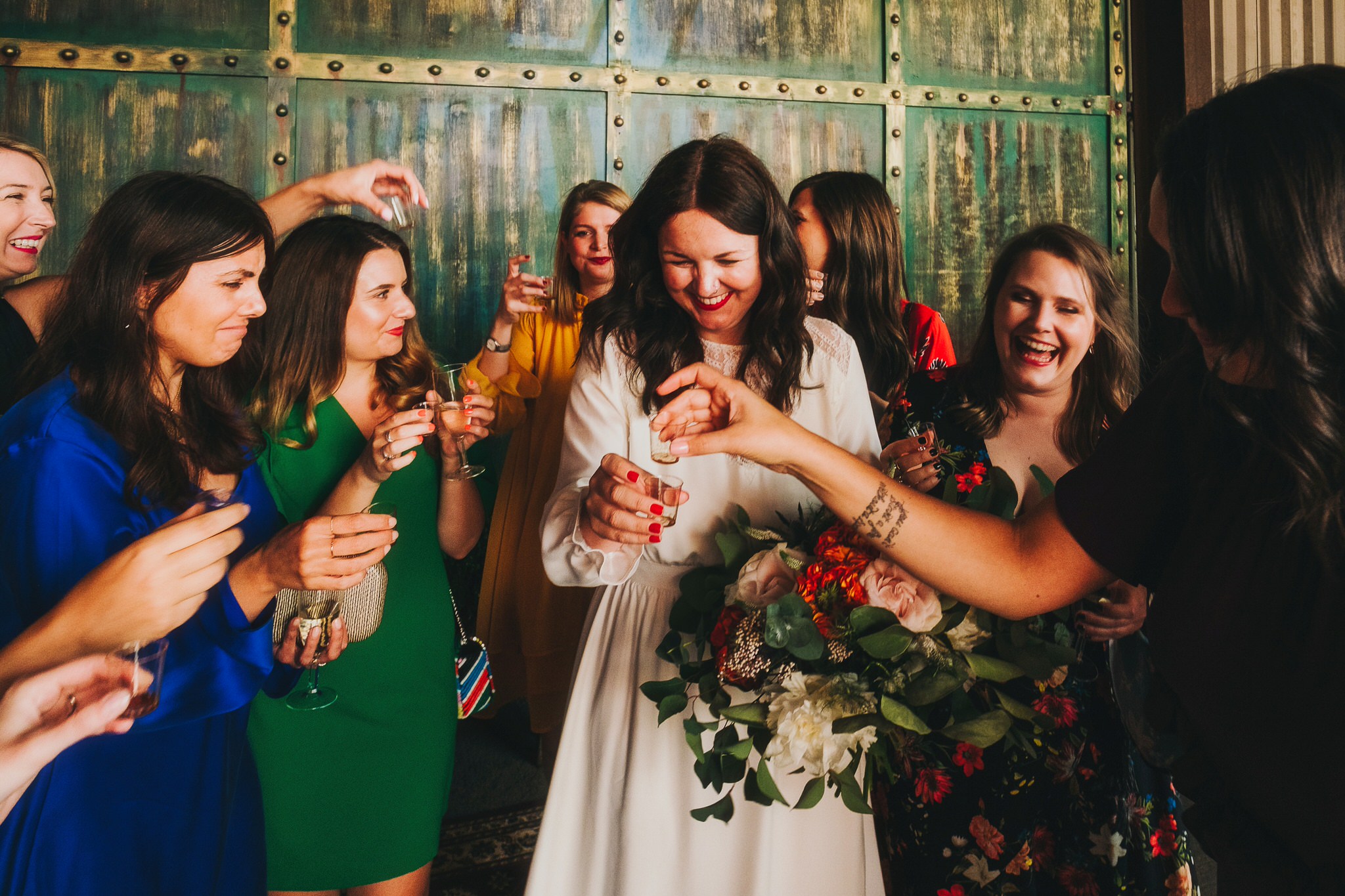 Amy got ready at her friend Abi's flat in Chorlton, surrounded by the most important women in her life: her mum Sue and mother-in-law Carol plus bridesmaids Steph & Jen, and there was such a relaxed vibe. Amy was such a low-maintenance bride, keeping incredibly calm and chilled throughout. She wore a beautifully simple tea-length gown designed by a local dressmaker in her native York and a pair of UNREAL teal velvet Miu Miu platforms, and looked so beautiful. She then hopped into a cab to get to the ceremony.